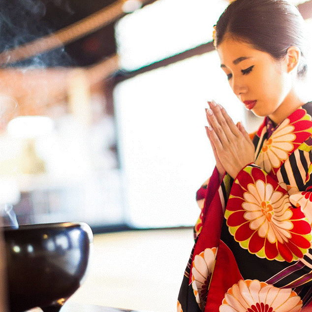 Persona con atuendo tradicional japonés practicando la atención plena con incienso en un entorno sereno.